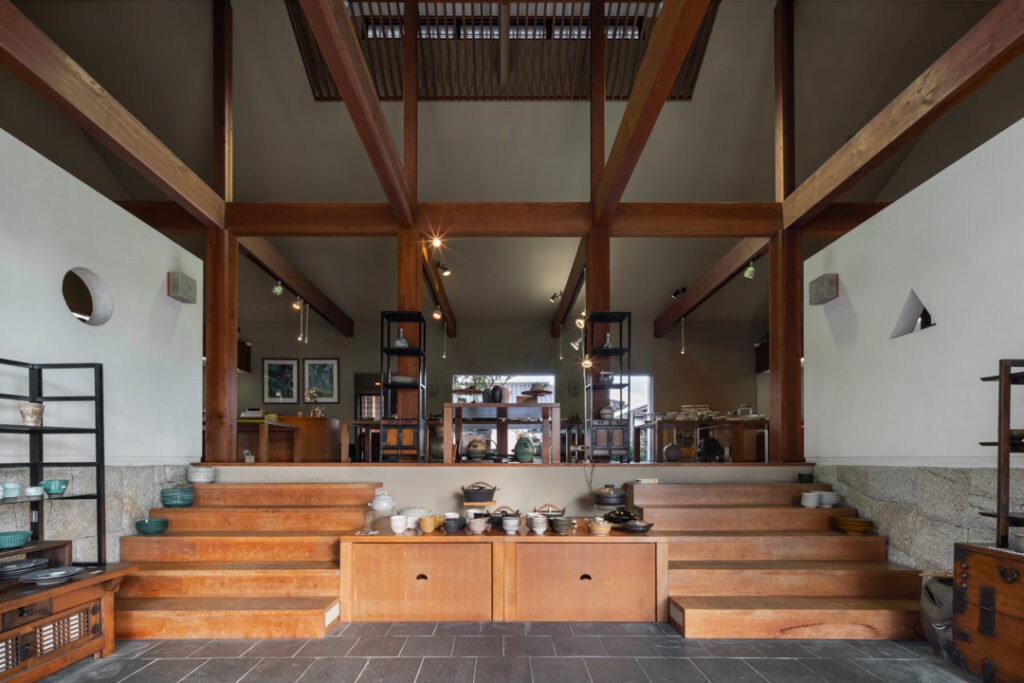 会社内にてショップ姿月窯を、2Fショールームではレストランなどで使用されるプロユースの食器を、ギャラリー喜楽庵では地元の陶芸作家作品を展示販売しています。